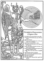 The great Pan was celebrated as the author and director of the sacred dances which he is supposed to have instituted to symbolize the circumambulations of the heavenly bodies. Pan was a composite creature, the upper part–with the exception of his horns–being human, and the lower part in the form of a goat. Pan is the prototype of natural energy and, while undoubtedly a phallic deity, should nor be confused with Priapus. The pipes of Pan signify the natural harmony of the spheres, and the god himself is a symbol of Saturn because this planet is enthroned in Capricorn, whose emblem is a goat. The Egyptians were initiated into the Mysteries of Pan, who was regarded as a phase of Jupiter, the Demiurgus. Pan represented the impregnating power of the sun and was the chief of a horde rustic deities, and satyrs. He also signified the controlling spirit of the lower worlds. The fabricated a story to the effect that at the time of the birth of Christ the oracles were silenced after giving utterance to one last cry, "Great Pan is dead!"p. 36