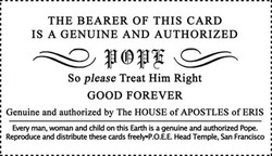 These business cards are for Joining The Illuminati, phone numbers for particularly fascist politicians, businesses and religions are to be printed on the cards along with a creative ironic phrase to be used as a password to use upon starting the phone conversation.