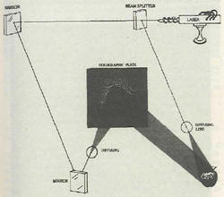 A hologram is produced when a single laser light is split into two separate beams. The first beam is bounced off the object to be photographed. Then the second beam is allowed to collide with the reflected tight of the first. When this happens they create an interference pattern which is then recorded on a piece of film (see fig, 1).