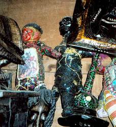 ← This Voodoo altar incorporates dolls, bottles and ordinary objects.