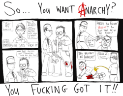 >Anarchy implies anything goesThe dictionary definition of anarchy is different to the ideology.