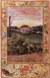One of the most striking depictions of the alchemical black sun is to be found on the second plate of the third sequence of illuminating paintings known as the Splendor Solis (c. 1532-1535). Here, the black sun is portrayed as a black orb from which an infinite crown of golden-orange rays emanate. It ascends over an irradiated town nested amidst a bountiful countryside that is itself divided into three dunes. Climbing higher and higher along the invisible rungs leading to the pinnacle of heaven, the sun’s rays pierce the rose-tinted wisps of cloud overhead but also the dense folds of earth in which vegetative and mineral life gestate. Indeed, the fire of life coming from the centre of the solar system is the same one that churns in the centre of the earth. This dual fire indicates that inner and outer and above and below are one reality. Perusing the vicinity of the aurora, one can see that the terrain is semi-translucent; the shape of the sun’s orb is clearly illuminated behind the meandering path which connects the horizon to the adjacent mounds of the countryside. A close examination also reveals the incongruous nature of the image; the fecundity and fruitfulness of the green hills and meadows closest to the horizon are juxtaposed by a foreground dominated by a desiccated watercourse. What confuses the issue further is that a bed of young shrubs and plants have miraculously sprouted from amid the dust. Finally, a cluster of dead tree stumps situated on the mound furthest from the horizon and around the bank of the watercourse serve as reminders that the ancient land from which they once sprouted is periodically atrophied by natural cataclysms and upheavals.