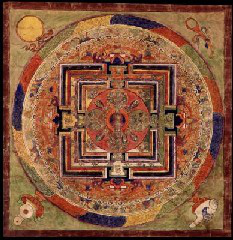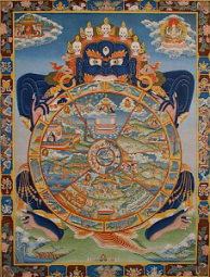 Then altogether and all at once, the peaceful and wrathful spiritual entities come before us. If we do not recognize them as our own projections, then they transform into the terrifying image of the Lord of Death. This too is our own projection. But if we don't accept that, our fear and turmoil force us to wander on in terror to the spiritual state of rebirth. We leave the spiritual state of the nature of mind. Again we are lost and wandering, so now we seek to end our suffering by being born into a solid and familiar place.