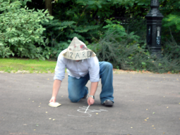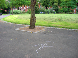 Sinead and I must have spent about three hours sitting in their chatting and drinking coffee. Afterward, we went to the crescent park just around the corner. When we got there I got out my notebook, a piece of chalk, my wizards hat and a sparkler. From my notebook I retrieved the design of a sigil I had recently made. The purpose of the sigil is to protect the punks who hang out in the park. I like the punks, so that was my motivation. I put on my wizards hat, then I drew the sigil on the ground. I stood over it with my sparkler outstretched in my left hand. I lit the sparkler and then held my right hand out over the sigil. I was passing the charge of the fire, earth air energy exchange, which was going on as the sparkler burnt, down through my left arm and out of my right down into the sigil.